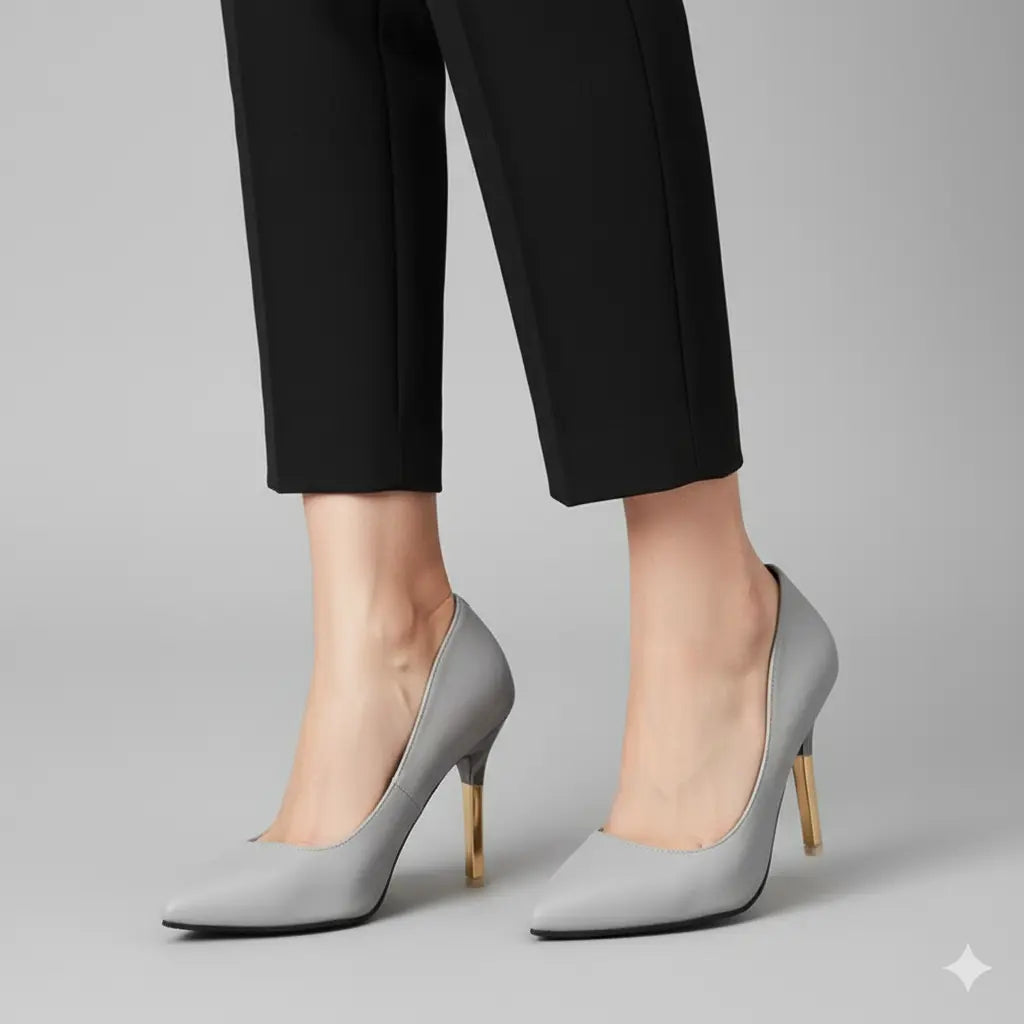 Détails techniques Bout pointu raffiné Talon fin doré transparent Finition lisse gris clair Style chic pour occasions ou bureau